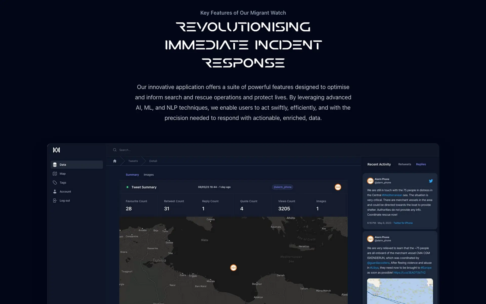 Discover how our cutting-edge application harnesses the power of AI, ML, and NLP technologies to pinpoint vulnerable migrants in need of urgent rescue at sea. Join us in our mission to prevent tragic losses and save lives by enabling timely intervention and support for those stranded in treacherous waters.
