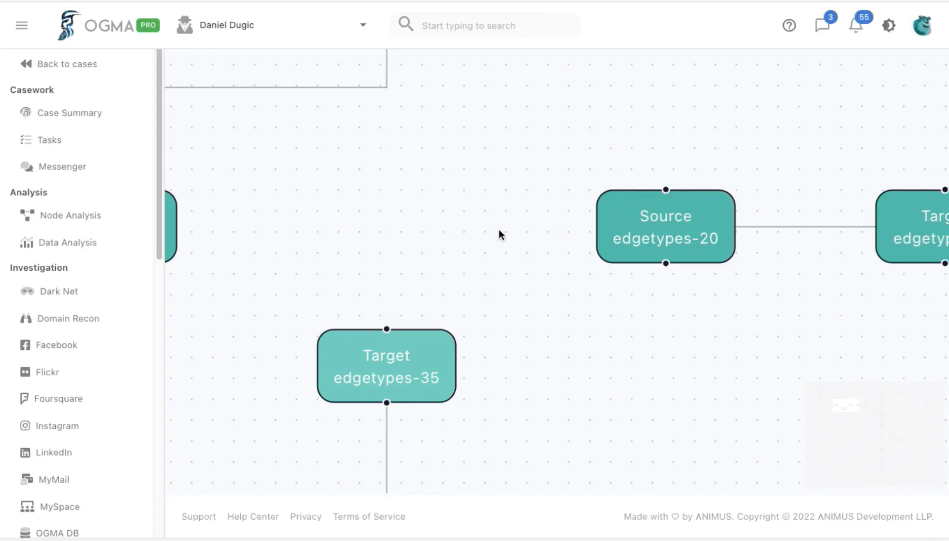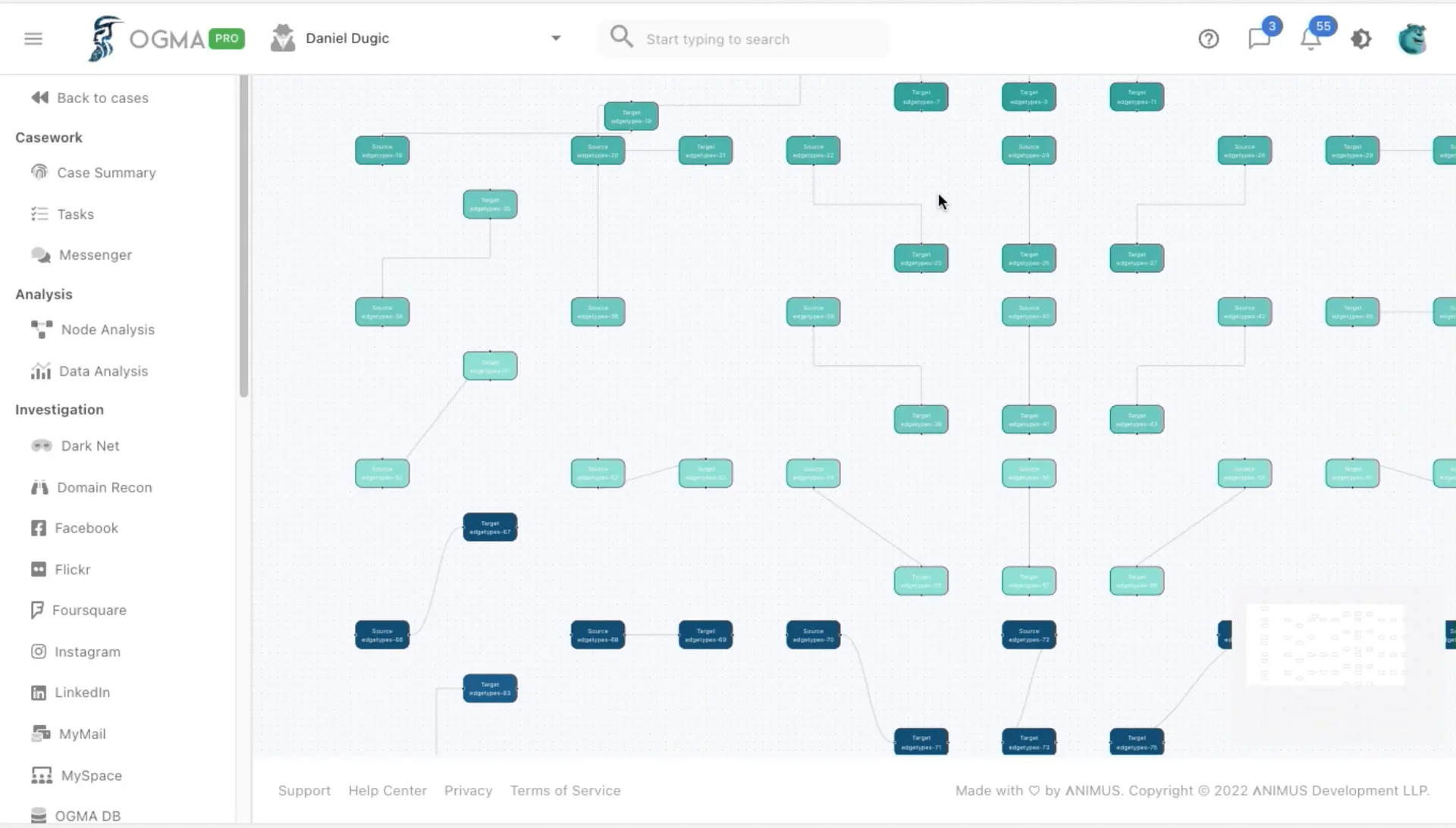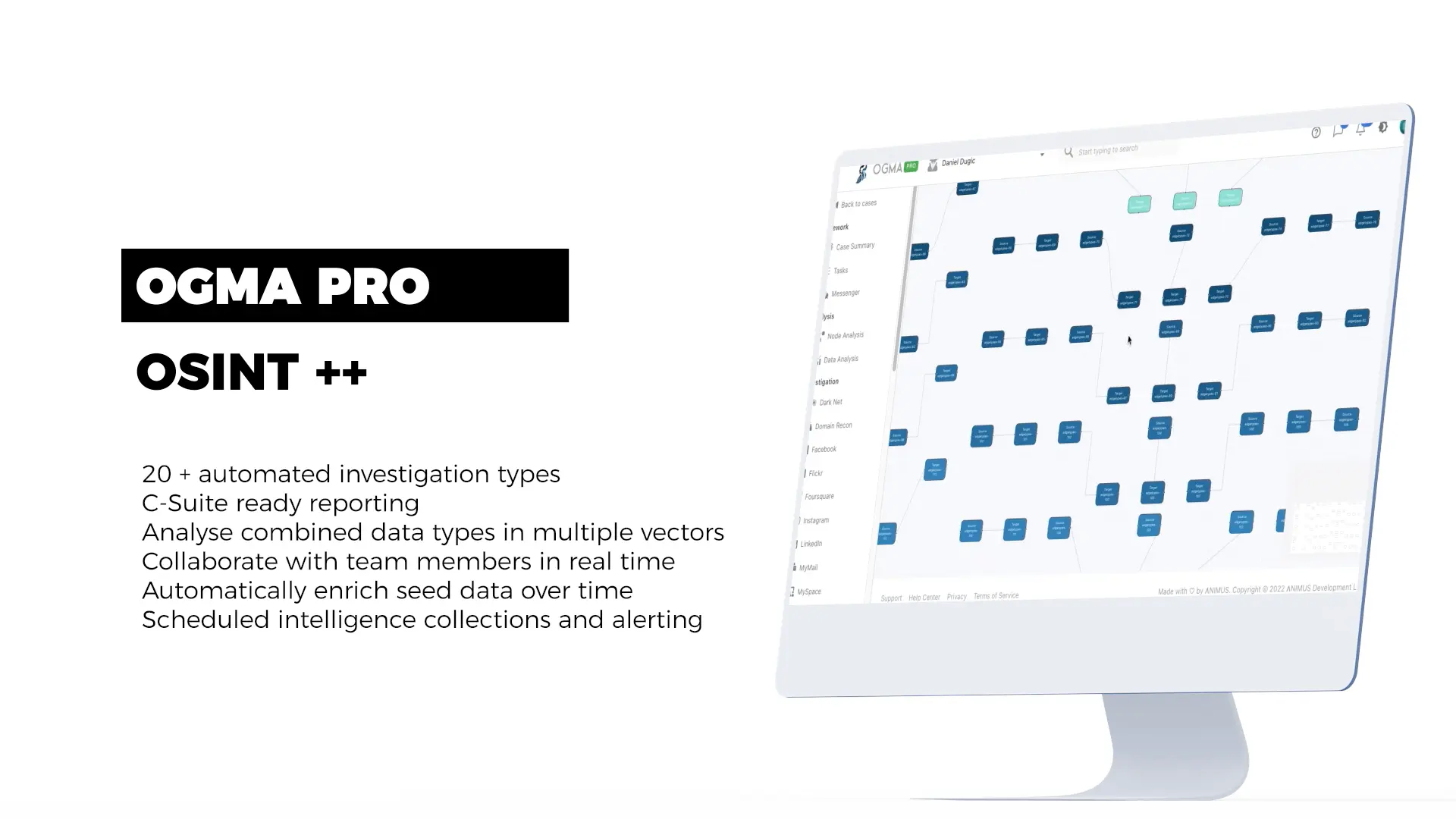 OGMA is a case driven application that takes a seed of information, be that an email address, known password, hash or name and derives meaningful intelligence product from that seed. OGMA allows for collaborative working, live updates and skins its results in multiple formats including data tables, node maps and graphing. OGMA produces C-Suite ready reporting product at the click of a button and allows analysts horsepower to be used in analysis and not typical mandraulic tasks that accompany its competitors.